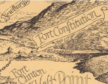 (Above) This map depicts West Point and surrounding areas, as they were during the American Revolution, with information on the area’s importance in the war and the various Revolutionary landmarks that line the river: the Great Chain, Fort Constitution, various redoubts, and others often cited in the Hudson River’s history.