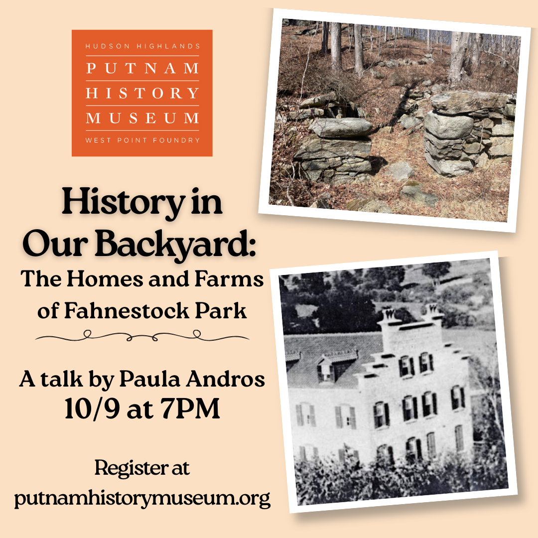 Gather at the Putnam History Museum on 10/9 to hear a talk on the historic homes and farms in Fahnestock State Park, including how the Fahnestock family left a lasting impact on Putnam County.