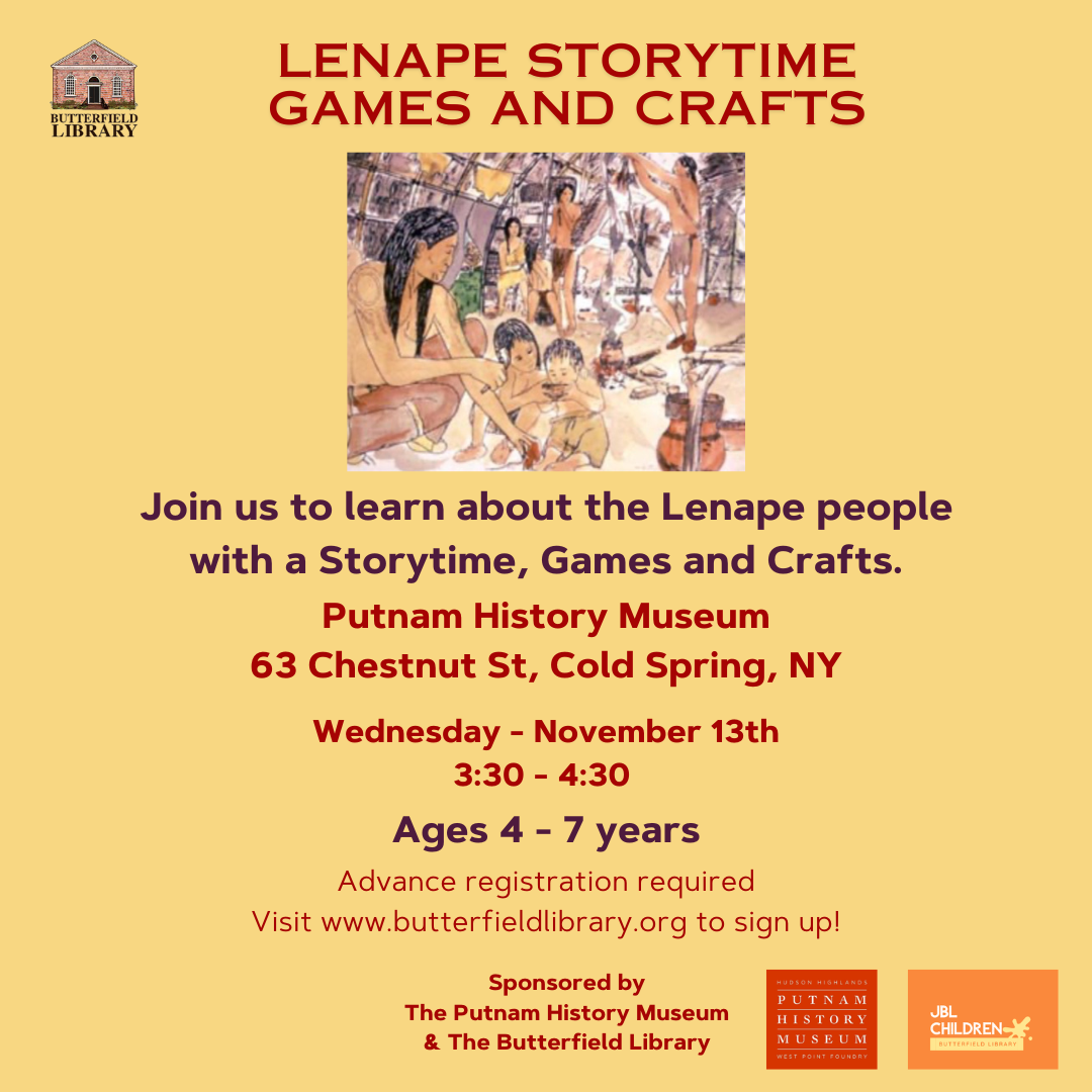 Join the Butterfield Library and the Putnam History Museum to learn about the Lenape people. There will be a Storytime along with games and crafts to celebrate the Indigenous people of the Northeastern Woodlands.