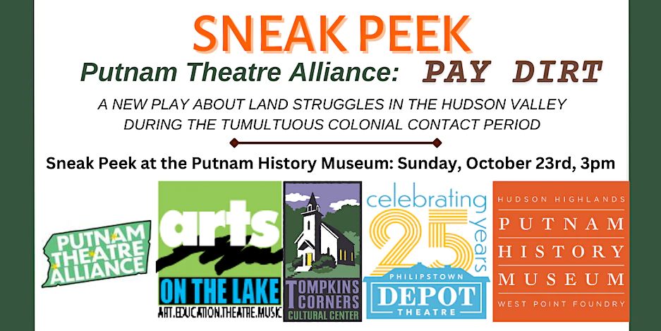 On Sunday, October 23rd, at 3 pm, please join us at the museum for a sneak peek of the Putnam Theatre Alliance’s upcoming production, Pay Dirt, featuring three one-act plays related to land struggles in the Hudson Valley during the Colonial Contact period (1600s to 1770s).